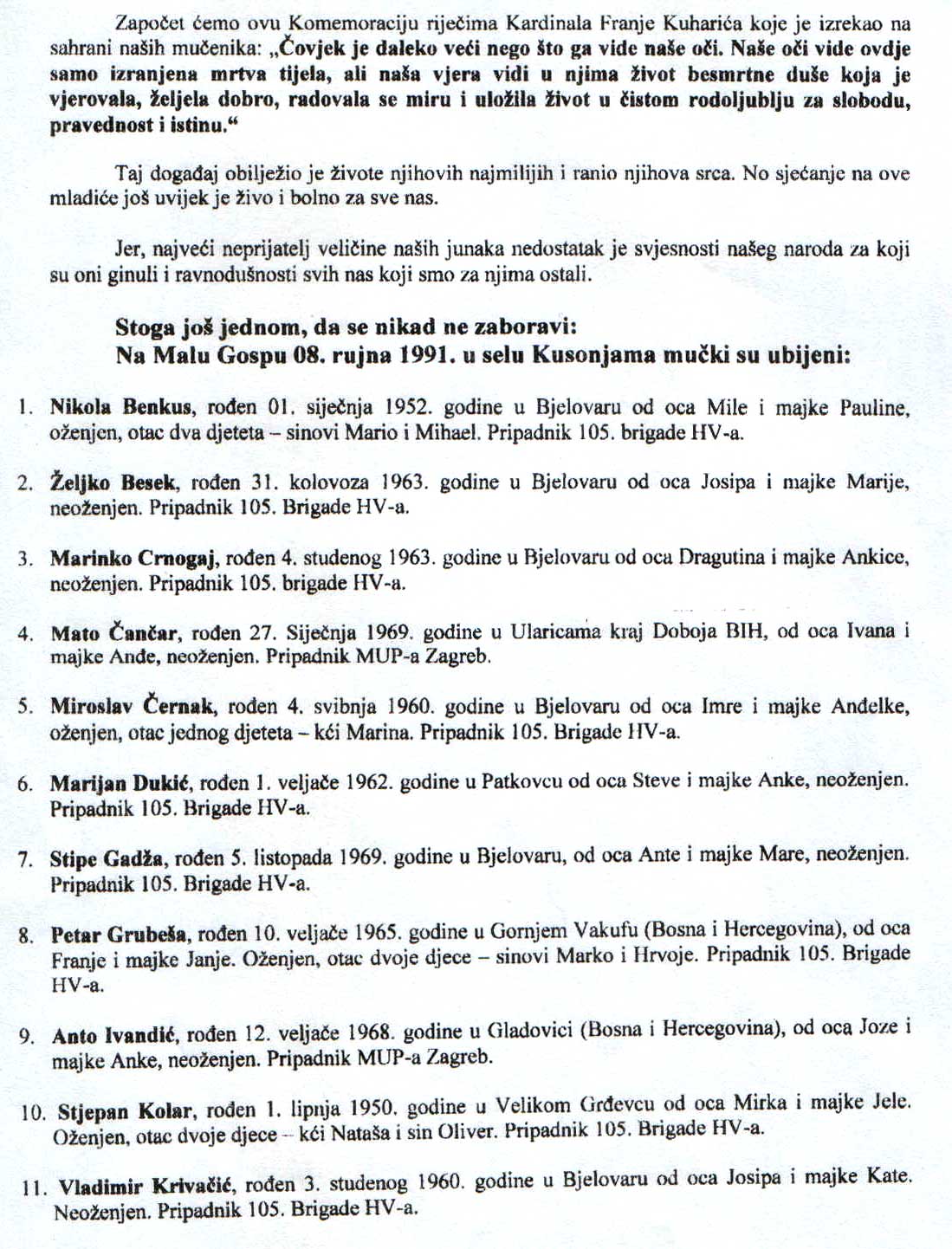Stoga još jednom, da se nikad ne zaboravi - na Malu Gospu 08. rujna 1991. u selu Kusonjama mučki su ubijeni: