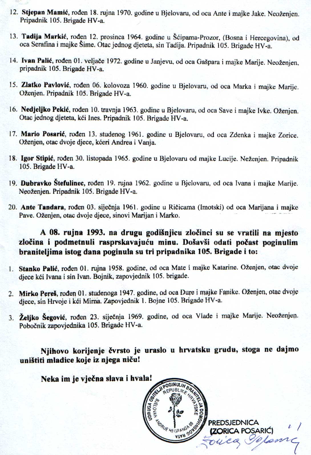 Željko Besek, rođen 31. kolovoza 1963. godine u Bjelovaru od oca Josipa i majke Marije, neoženjen. Pripadnik 105. brigade HV-a.