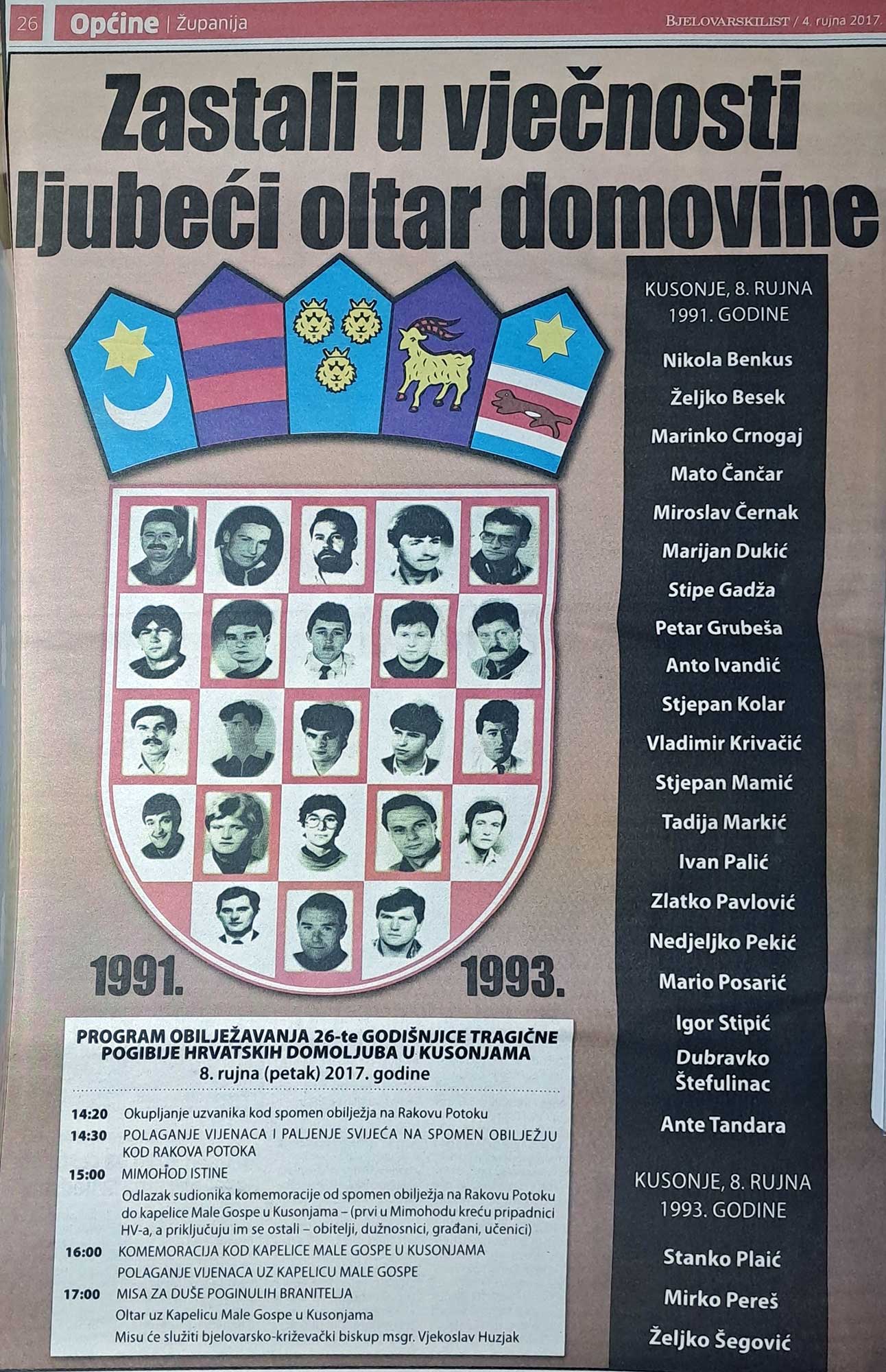 Iako su prošla više od dva desetljeća, još uvijek su svježe rane na srcu roditelja, djece, suboraca i prijatelja hrvatskih branitelja poginulih u Kusonjama 1991. godine. Njihova tijela nisu odmah pronađena, ali je upornom akcijom otkrivena zajednička grobnica, tijela ekshumirana i posmrtni ostaci sahranjeni 5. veljače 1992. godine. U Kusonjama je život ostavilo 18 Bjelovarčana, a sjećanje na njih godinama njeguju članovi Udruge obitelji poginulih branitelja Kusonje 1991/1993. Predsjednik Udruge Ivan Dukić u Kusonjama je ostao bez brata, a i ovoga puta ponavlja kako su poginuli branitelji sve nas zadužili da se brinemo za Hrvatsku i da našoj djeci stvorimo lijepu budućnost.