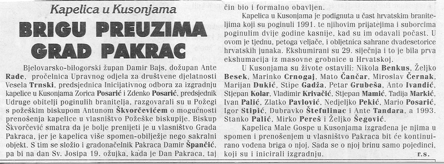 Bjelovarsko-bilogorski župan Damir Bajs, dožupan Ante Rade, pročelnica Upravnog odjela za društvene djelatnosti Vesela Trnski, predsjednica Inicijativnog odbora za izgradnju kapelice u Kusonjama Zorica Posarić i Zdenko Posarić, predsjednik Udruge obitelji poginulih branitelja, razgovarali su u Požegi s požeškim biskupom Antunom Škvorčevićem o mogućnosti prenošenja kapelice u vlasništvo Požeške biskupije. Biskup Škvorčević smatra da je bolje prenijeti je u vlasništvo Grada Pakraca, jer je kapelica više spomen-obilježje nego sakralni objekt. S tim se složio i gradonačelnik Pakraca Damir Špančić, pa bi na dan Sv. Josipa 19. ožujka, kada je Dan Pakraca, taj čin bio i formalno obavljen.