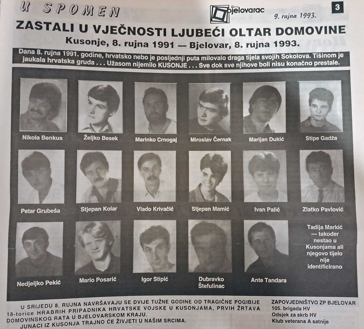 Zato molim u ime ljudstva, u ime Boga i kršćanskog roda da se učini nešto više, brže, da se dođe do istine onih 15 mladih života. Molim Vas u ime svih herceg-bosanaca ovog kraja, koji su u ovom nametnutom prljavom ratu dali, daju i davat će sve od sebe pa i svoje živote da oslobodimo našu domovinu Hrvatsku od srpskog jarma i okupatorske vojne, hladne i mračne beštije. Molim ove golobradate da nam oslobode žive heroje i dovezu ih u Bjelovar, a isto tako i 'one mrtve da nam dovezu kako bi ih sahranili dostojanstveno. Molim te golobradate koji se šepure po Bjelovaru da to učine, jer to oni mogu ako hoće. Molim ih neka se otkupe u ime sveg što su nam spremali, što su radili, što su htjeli i żeljeli. Nemoćni su da nam bilo što učine po svojim zacrtanim planovima, jer smo i prevelika planina za njih, pretvrd orah, zato, možda ovo čuju, neka se otkupe jer već sutra i za Njih može biti kasno.