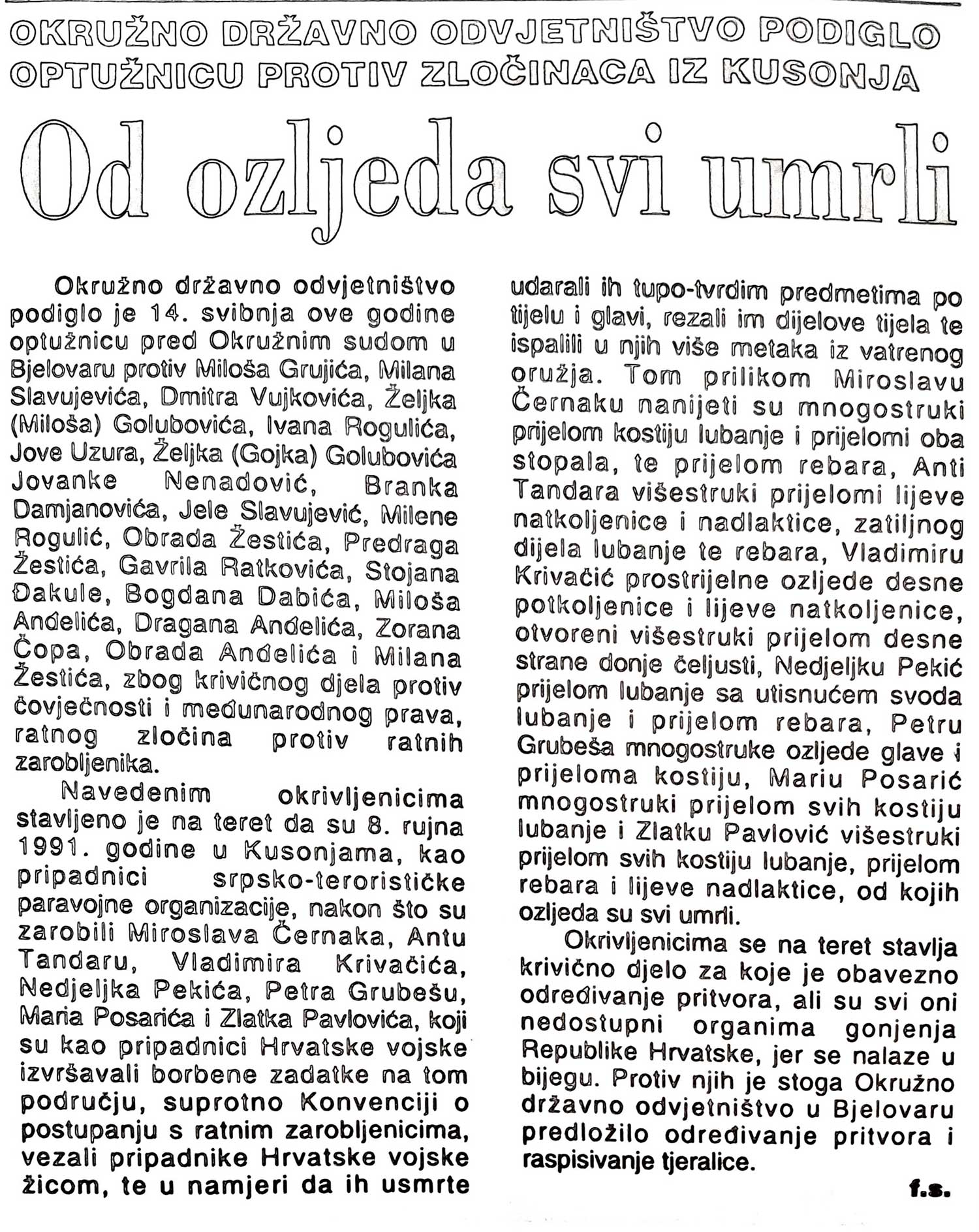 Navedenim okrivljenicima stavljeno je na teret da su 8. rujna 1991. godine u Kusonjama, kao pripadnici srpsko-terorističke paravojne organizacije, nakon što su zarobili Miroslava Černaka, Antu Tandaru, Vladimira Krivačića, Nedjeljka Pekića, Petra Grubešu, Maria Posarića i Zlatka Pavlovića, koji su kao pripadnici Hrvatske vojske izvršavali borbene zadatke na tom području, suprotno Konvenciji o postupanju s ratnim zarobljenicima, vezali pripadnike Hrvatske vojske žicom, te u namjeri da ih usmrte udarali ih tupo-tvrdim predmetima po tijelu i glavi, rezali im dijelove tijela te ispalili u njih više metaka iz vatrenog oružja. Tom prilikom Miroslavu Černaku nanijeti su mnogostruki prijelom kostiju lubanje i prijelomi oba stopala, te prijelom rebara, Anti Tandari višestruki prijelomi lijeve natkoljenice i nadlaktice, zatiljnog dijela lubanje te rebara, Vladimiru Krivačiću prostrijelne ozljede desne potkoljenice i lijeve natkoljenice, otvoreni višestruki prijelom desne strane donje čeljusti, Nedjeljku Pekiću prijelom lubanje sa utisnućem svoda lubanje i prijelom rebara, Petru Grubeši mnogostruke ozljede glave i prijeloma kostiju, Mariu Posariću mnogostruki prijelom svih kostiju lubanje i Zlatku Pavlović višestruki prijelom svih kostiju lubanje, prijelom rebara i lijeve nadlaktice, od kojih ozljeda su svi umrli.