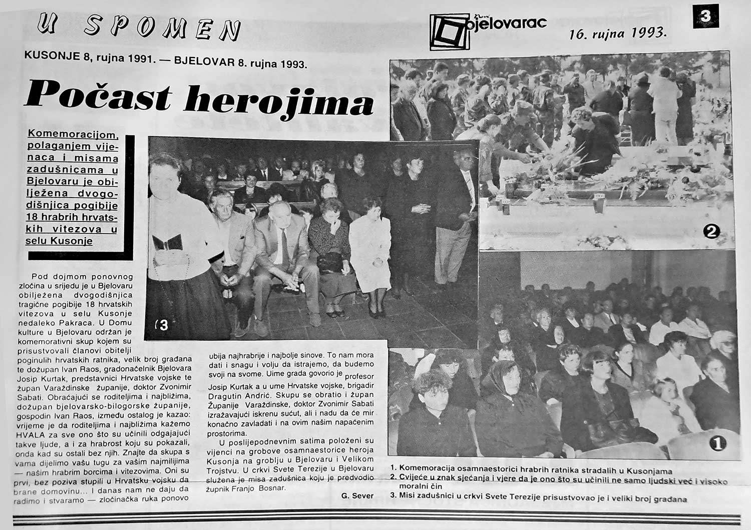 Pod dojmom ponovnog zločina u srijedu je u Bjelovaru obilježena dvogodišnjica tragične pogibije 18 hrvatskih vitezova u selu Kusonje nedaleko Pakraca. U Domu kulture u Bjelovaru održan je komemorativni skup kojem su prisustvovali članovi obitelji poginulih hrvatskih ratnika, velik broj građana te dožupan Ivan Raos, gradonačelnik Bjelovara Josip Kurtak, predstavnici Hrvatske vojske te župan Varaždinske županije, doktor Zvonimir Sabati. Obraćajući se roditeljima i najbližima, dožupan Bjelovarsko-bilogorske županije, gospodin Ivan Raos, između ostalog je kazao: