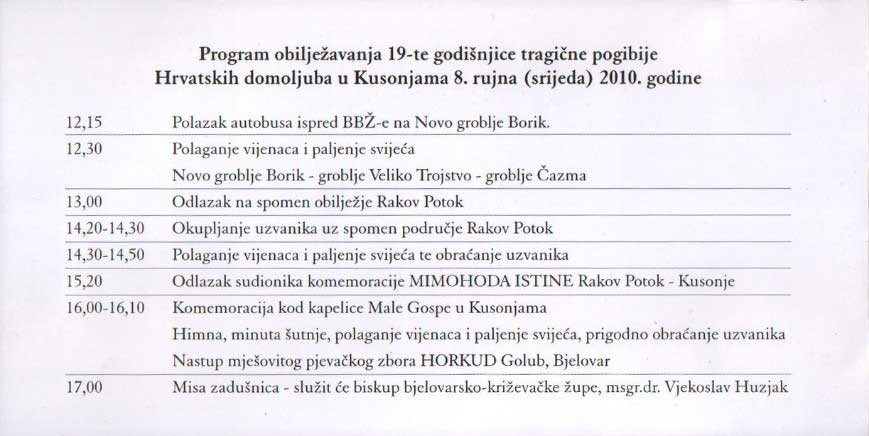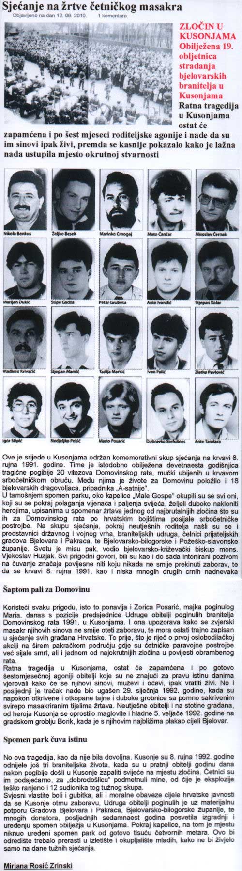 Ove je srijede u Kusonjama održan komemorativni skup sjećanja na krvavi 8. rujna 1991. godine. Time je istodobno obilježena devetnaesta godišnjica tragične pogibije 20 vitezova Domovinskog rata, mučki ubijenih u krvavom srbočetničkom obruču. Među njima je živote za Domovinu položilo i 18 bjelovarskih dragovoljaca, pripadnika „A-satnije".