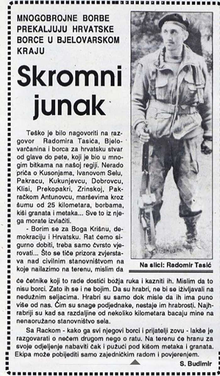 Teško je bilo nagovoriti na razgovor Radomira Tasića, Bjelovarčanina i borca za hrvatsku stvar od glave do pete, koji je bio u mnogim bitkama na našoj regiji. Nerado priča o Kusonjama, Ivanovom Selu, Pakracu, Kukunjevcu, Dobrovcu, Klisi, Prekopakri, Zrinskoj, Pakračkom Antunovcu, marševima kroz šumu od 25 kilometara, borbama, kiši granata i metaka… Sve to iz njega morate izvlačiti.
