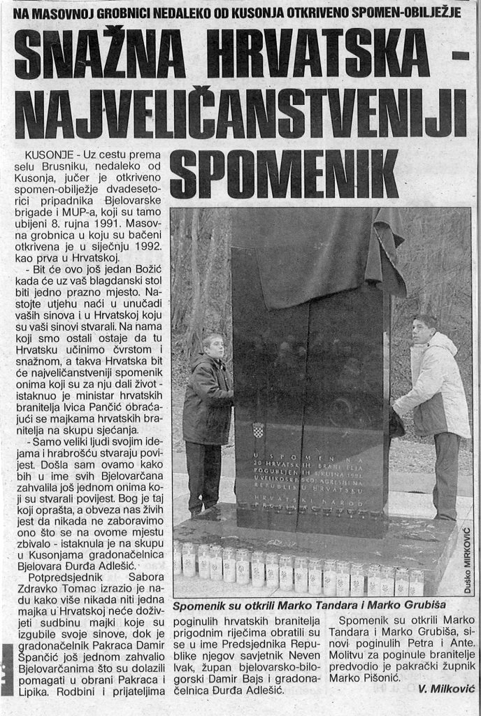 KUSONJE - Uz cestu prema selu Brusniku, nedaleko od Kusonja, jučer je otkriveno spomen-obilježje dvadesetorici pripadnika Bjelovarske brigade i MUP-a, koji su tamo ubijeni 8. rujna 1991. Masovna grobnica u koju su bačeni otkrivena je u siječnju 1992. kao prva u Hrvatskoj.