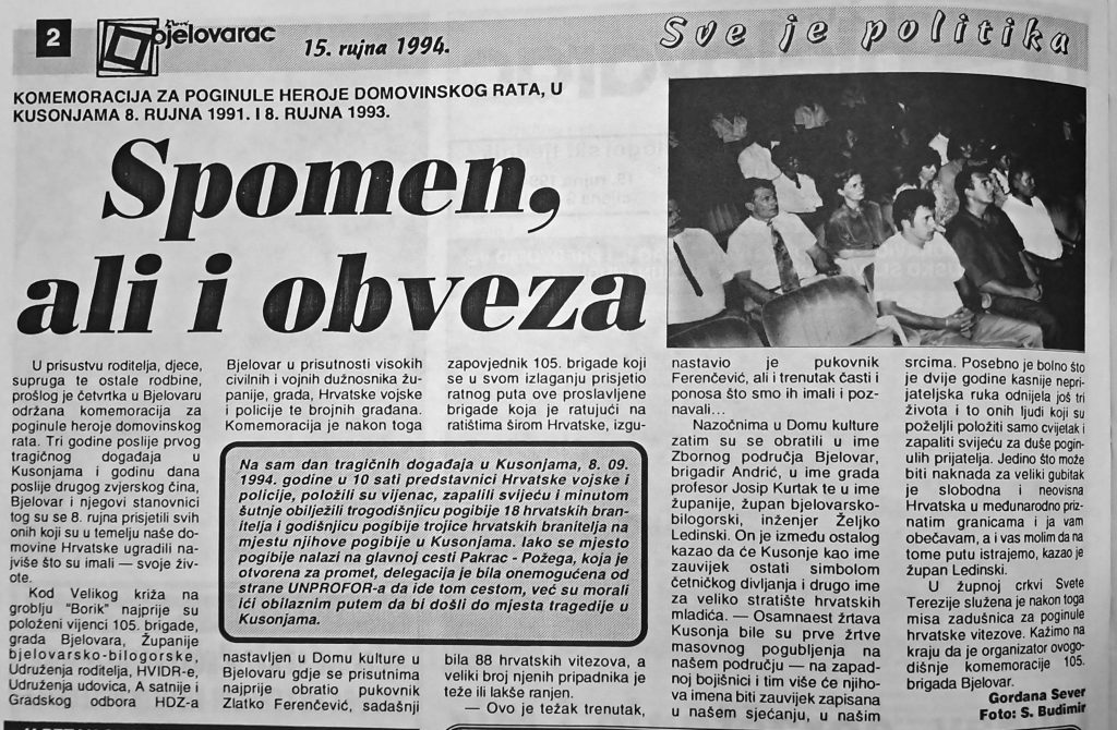 KOMEMORACIJA ZA POGINULE HEROJE DOMOVINSKOG RATA, U KUSONJAMA 8. RUJNA 1991. I 8. RUJNA 1993.