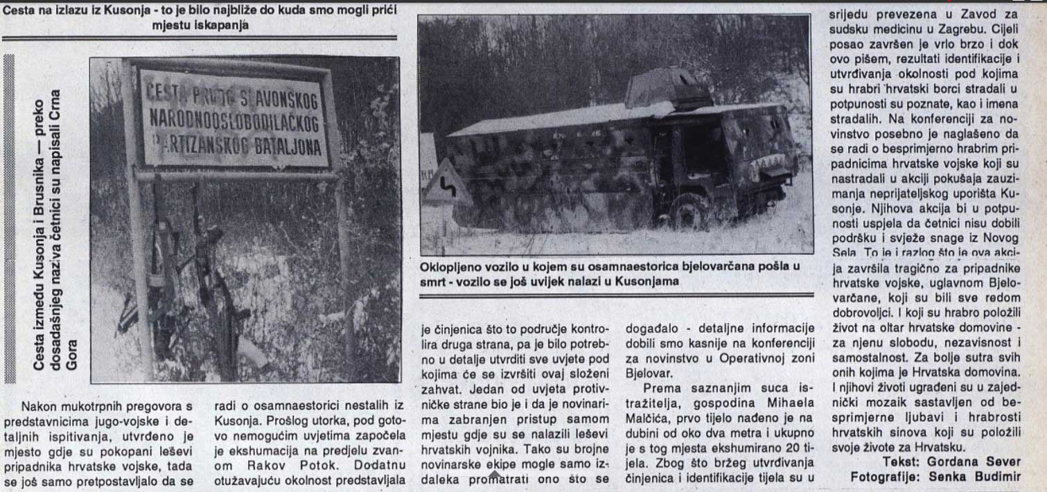 Nakon mukotrpnih pregovora s predstavnicima jugo-vojske i detaljnih ispitivanja, utvrđeno je mjesto gdje su pokopani leševi pripadnika hrvatske vojske, tada se još samo pretpostavljalo da se radi o osamnaestorici nestalih iz Kusonja. Prošlog utorka, pod gotovo nemogućim uvjetima započela je ekshumacija na predjelu zvanom Rakov Potok. Dodatnu otežavajuću okolnost predstavljala je činjenica što to područje kontrolira druga strana, pa je bilo potrebno u detalje utvrditi sve uvjete pod kojima će se izvršiti ovaj složeni zahvat. Jedan od uvjeta protivničke strane bio je i da je novinarima zabranjen pristup samom mjestu gdje su se nalazili leševi hrvatskih vojnika. Tako su brojne novinarske ekipe mogle samo izdaleka promatrati ono što se događalo - detaljne informacije dobili smo kasnije na konferenciji za novinstvo u Operativnoj zoni Bjelovar.