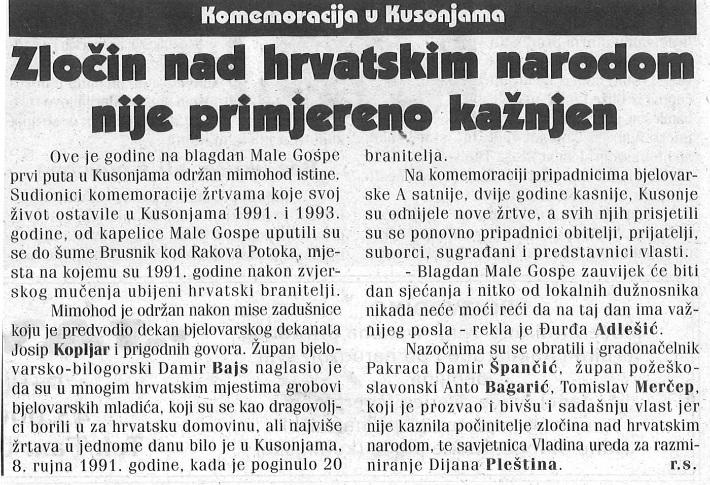 Ove je godine na blagdan Male Gospe prvi puta u Kusonjama održan mimohod istine. Sudionici komemoracije žrtvama koje svoj život ostavile u Kusonjama 1991. i 1993. godine, od kapelice Male Gospe uputili su se do šume Brusnik kod Rakova Potoka, mjesta na kojemu su 1991. godine nakon zvjerskog mučenja ubijeni hrvatski branitelji.